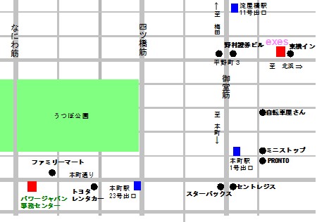 周辺地図 株式会社パワージャパン スポーツクラブ exes 本社 〒550-0005 大阪市西区西本町1-13-38 6F スポーツクラブ exes 〒541-0046 大阪市中央区平野町3-4-9 2F アクセス 電車の場合 大阪市地下鉄四ツ橋線本町駅23出口を出て、本町通りを西へ約3分